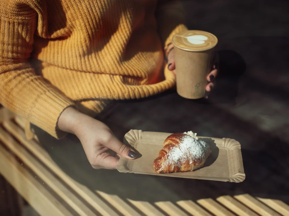 Každé ráno voní čerstvé pečivo – ostružinový koláček, čokoládová rolka nebo croissant s pistáciovým krémem. Těžko odolat.